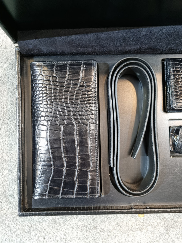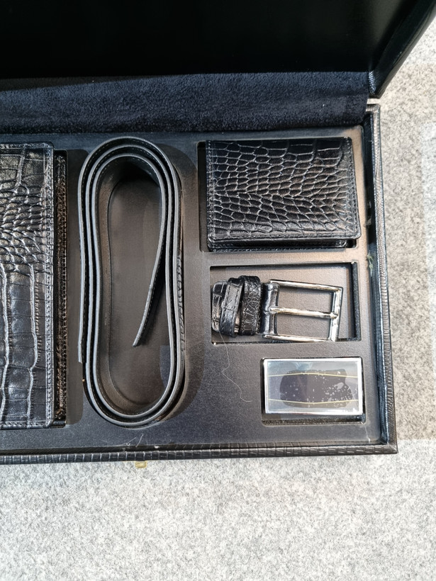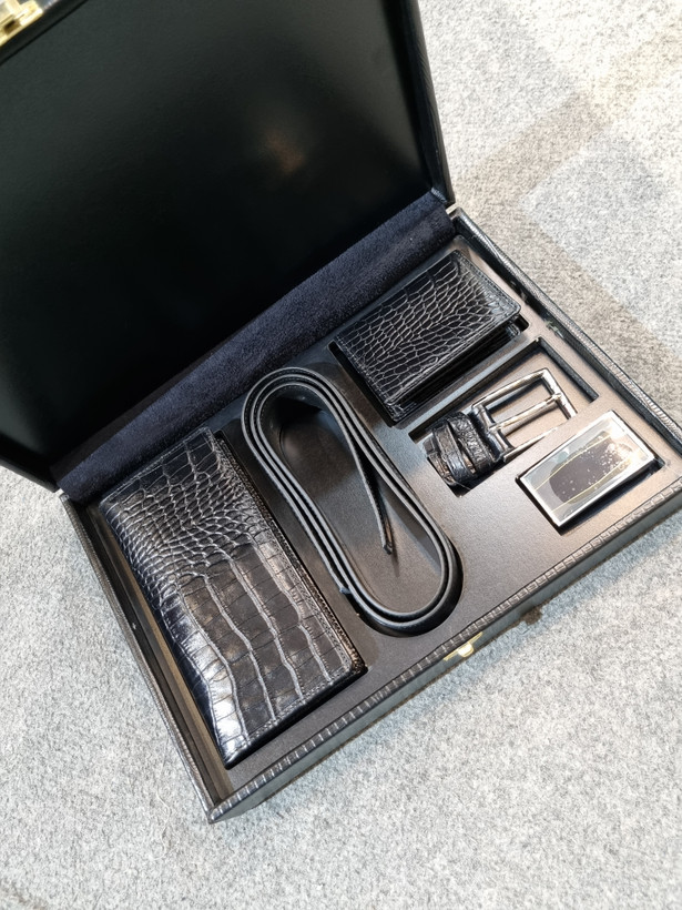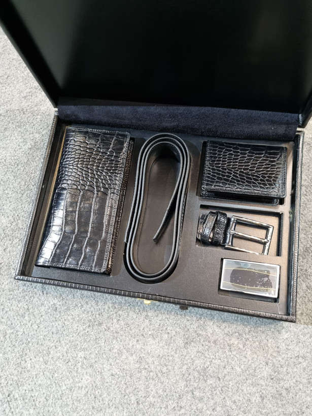 این محصول از چرم طبیعی اعلا تولید شده است و یک ست بسیار خاص و لاکچری برای استفاده هستش.در این ست سه محصول ترکیب شده است که شامل کیف پولی،جاکارتی و کمربند که کمربند این ست دارای دو سری مختلف پلاکدار و میخی میباشد. این محصول بهترین گزینه برای هدیه دادن برای آقایون میباشد.